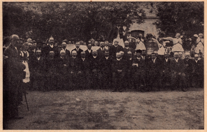 Az új harangok megérkezése. Tóth Bertalan lelkész (középen), Polgár Ferenc kántor (jobbra), Enyedi János főgondok (balra) a presbiterek gyűrűjében