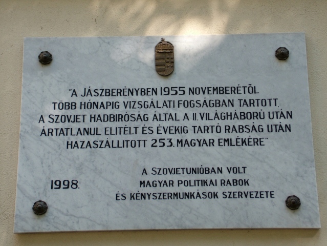 1998-ban Szovjetunióban Volt Magyar Politikai Rabok és Kényszermunkások Szervezete (Szorakész) emelet emléktáblát a jászberényi városháza falán. [A táblán sorszámnak tünhet a 253 után tévesen kitett pont.]